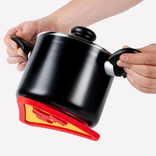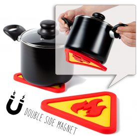 A fun and practical double magnet kitchen trivet made of heat resistant silicone to protect your table from heat damage. With the shape of an industrial fire warning sign, this kitchen trivet attaches magnetically to the bottom of your pot.