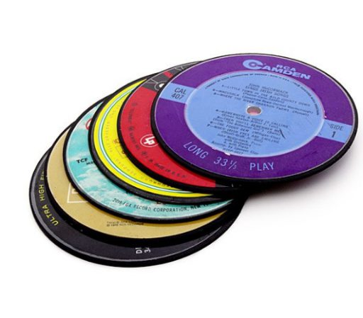 ** Because these coasters are made from real recycled records, each set will include a variety of album genres.
